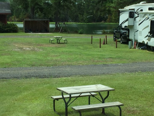 Realized when we arrived we had been here two years ago. Price has gone up $10 since then. Pretty little campground on a nice pond. FHU back in and pull thru sites on grassy lots with picnic table. Community room and fishing in pond. Road can get noisy but not terrible. Nicely groomed. Owner is nice and us house onsite. Didn’t use facilities so can’t speak to that. They don’t allow you to use onboard laundry, must use theirs or go to laundromat. Cable TV is good but WiFi is hit or miss.