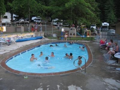Stsyed here to days in May 2017. Park is very nice, owners are new and cant do enough to make your stay any better. Its OFF the interstate and thats a great thing. (No road noise). Park is located in a small mountain valley on the East end of the lake town is 10 miles away. Greats trees, grass, kids can run and play and parents not worry about traffic. Full services, and yes a swiming pool. Level lots.