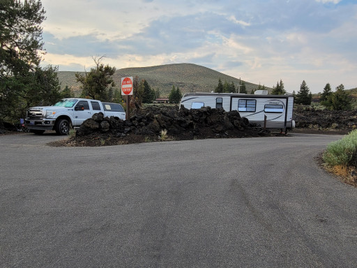 It's a nice campground but hot in the summer. There about five spots that can handle 35 ft RV's but they go fast. It's first come first served so you could possibly find a tent in a pull through. It's mostly an overnight spot for travelers so it starts to empty around 9 a.m. and starts filling around 3 p.m. Closest dump dites are Carey and Arco. The park encourages you to fill your fresh water tank prior to coming to the park. They do have pressurized spigots throughout the campground. They also have two well maintained flush bathrooms in the campground but no showers. Some of the roads in the campground have tight turns for big rigs or 5th wheels but warning signs are posted to prevent entering these areas. No power so you can run generators most of the time, quiet hours are posted. Real nice visitors center as you enter the park. Ranger guided tours through the park or you can drive through the park and hike the many trails. Dogs not allowed on the trails. No campfires in campground.