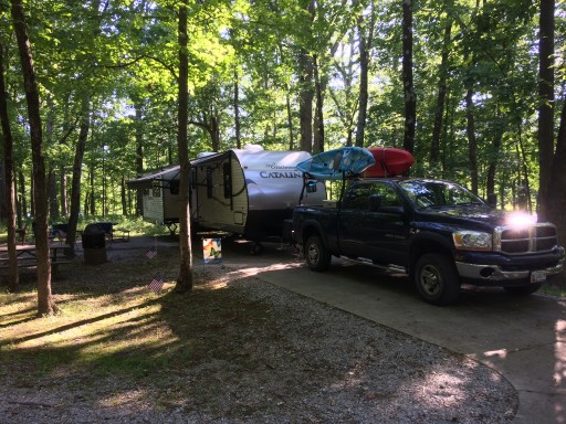 We were looking for a overnight camp, close to I70....this is close, but not directly on so very convenient. Lovely park, lots of big shade trees, lengthy sites and there is water access (fill up tank before you unhook). Showers and toilet house, clean and stocked. We would definitely stay here again!