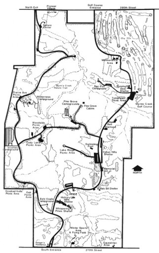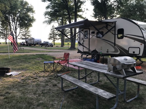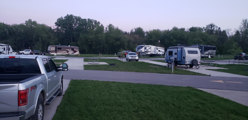 We camped at Bald Eagle which is a full service campground within Scott Cty Park. Large grassy sites with paved level double wide pads and concrete patios makes for clean camping even in the rain. Restrooms were large, modern, and the cleanest of any campground I’ve visited. Bald Eagle also has its own playground for kids and the roads around the campground are paved which is nice for bike riding. Wooded hiking trails connect the campground to the parks many other amenities including lakes, swimming pool, picnic shelters, other playgrounds, volleyball/basketball courts, golf course and a pioneer village. Plan to bring 30-50 ft of hose to reach the water source on some sites.