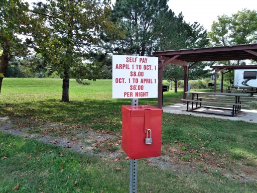 $6-$8 for water and 50 amp service. Connected to city park in nice little town. Train passes through twice in the night, but really not that bad over the sound of the air conditioners in the RV. Cheese factory and antique shopping in town. Worth a night.