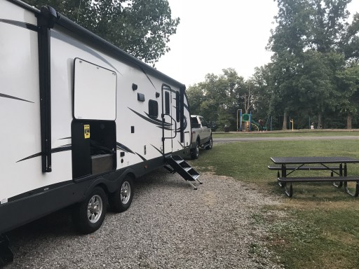 We stayed in spot 32. All in all a nice park. It was super busy when we were there. Site 32 was well shaded but a bit sloped. Couldn’t get the nose down enough for true level but close enough. Fire ring is down a decently steep slope. Sites were adequately wide I think.