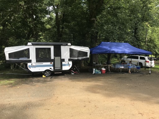 Site 137 is pretty private and near the river in a cul-de-sac, but also close to the cement plant and route 627. Bath house was air conditioned, clean and good shower. It rained a lot while we camped in our travel trailer so there was some minor flooding in the campground although not our site. Camp store was well stocked and staff was friendly.