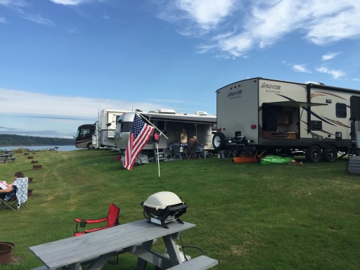 Camped in sited 12B with a 28 foot camper. The site was equipped with water, electric both 30 and 50 amp, a fire ring, and a picnic table. The site was grassy, fairly level, and came with an amazing ocean view. It was also spacious. The inside sites were kind of cramped as were the sites to the left as you drive in. They have a free dump station, and are dog friendly. $1 for a bag of ice, $3 for a good sized bundle of firewood, $40 per night for your camp site. They also have free coffee every morning, along with a full bath house, and free WIFI. They have a cute little camp store as well. We had a wonderful stay and would definitely stay here again!