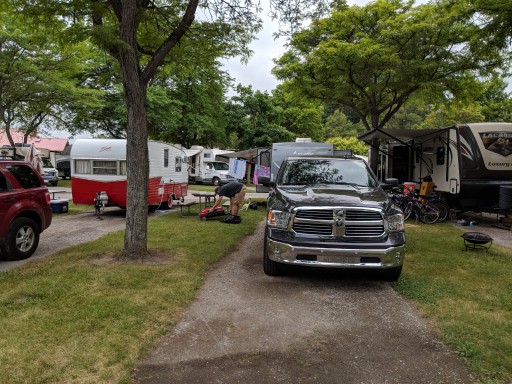 The sites are tiny and poorly laid out. My site is so small our awning can’t go out all the way. Also, my neighbor’s sewer, electric, and water hook ups are in the middle of our tiny lawn area. It’s uncomfortable. We are so crammed I can almost hear them breathing in their camper. Also, we stayed during the week so there were numerous open sites throughout the park so I don’t understand why they put someone right next to us. It’s bizarre. Also, the showers are cold with push button faucets that have to cycle through (1 minute per cycle) before getting warming. Booking here reminds me of choosing the wrong item off of a menu. I wished I booked the campground up the street for my stay in Frankenmuth. Sigh.