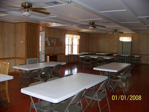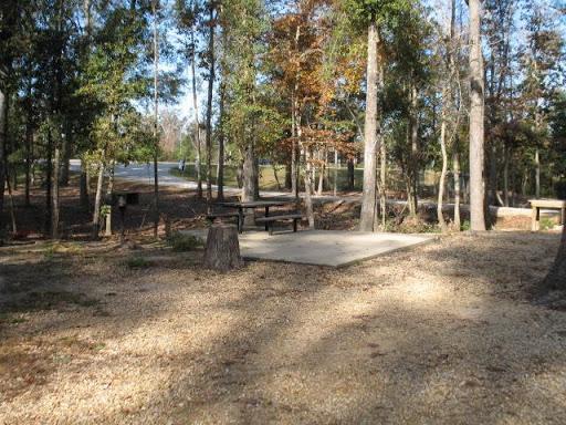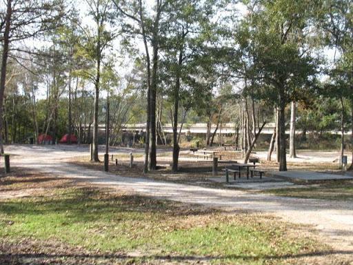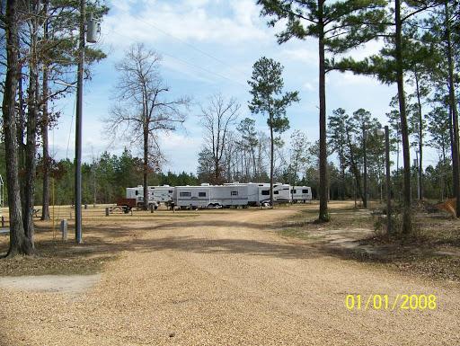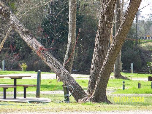 Near the rear causing a low level noise effect from both sides. The spots are dirt, but level. 50 amp service plus water/sewer plus marginal cable are included. Beware the mosquitos near sunset. Biggest swarms I've ever seen.