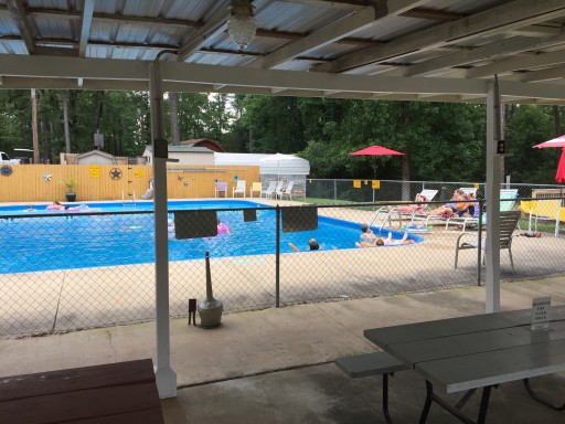 Concrete pull thru site cracked in multiple pieces, but was still semi-level. Pull thru spaces were tight. Rained really hard, but drainage was good. The front entrance was badly rutted, but they were adding gravel to fix. The water slide was fun so probably would stay 1 night again