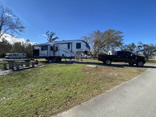 Nice park with level sites. No fire rings, which we were disappointed about. Park was pretty empty when we stayed there. If booked it would be pretty tight between rigs. The drive in is less than optimal. We came from the east on I-10. Had to go through some residential neighborhoods with low branches. Streets narrow with no shoulder at points. There’s a steep hump to go over the train tracks. We made it okay but could see how bigger rigs might bottom out. (We are F250 with 36’ fifth wheel, 13’2H)