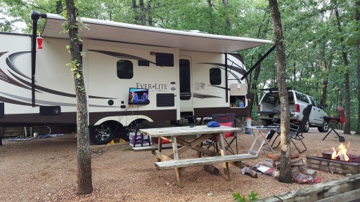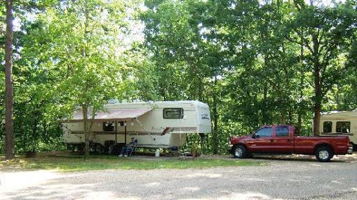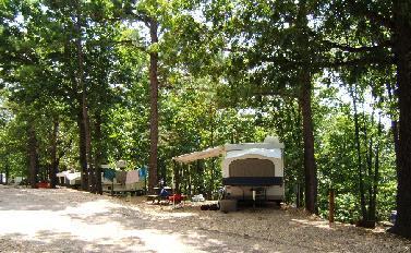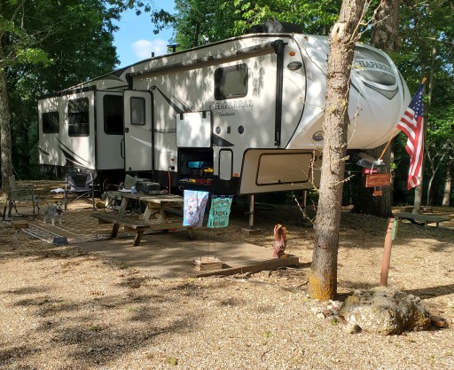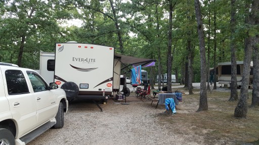 On the positive side this campground has very nice tall mature trees that provide a nice shade. The price is lower than campgrounds down the road. The site we used was easy to back into but took 3.5” of blocks to level side to side. The roads have not been maintained well. There are huge potholes and ruts. Roads width and sites not designed for modern units with slides. Roads are steep and narrow. This place is past its prime. The “scenic overlook” was so overgrown all you could see was brush. Bathrooms old and musky. The office smelled of cigarette smoke. If you have a small camper and all you use are full hookups it might work better for you.