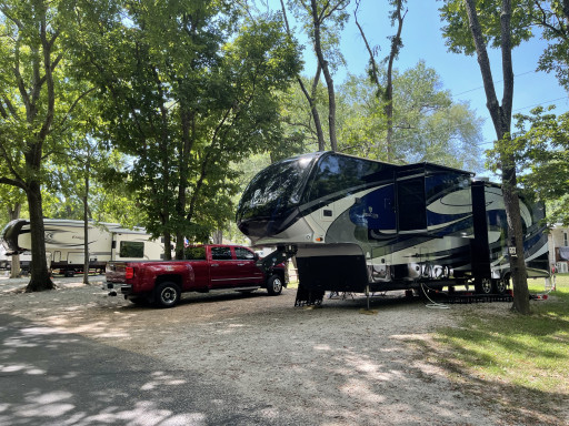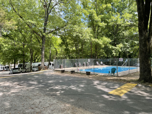 Only one way in and out with tight roads. We had 40ft but glad never met another rig on road in would be difficult. Sites on a slant going up hill. Level if overlooking river. Had to override auto level as we were on slight hill. Bathroom, showers are old, not fresh smelling. Affordable boat rentals and nice dock for fishing. True wooded experience. They have small pool looks clean. Cabins look nice.