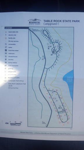 Using the Recreation.gov app I reserved a campsite in a state park near Branson MO. I searched for Table Rock State Park but got Eagle Rock State Park. Eagle Rock Campground is over an hour drive from Branson. That drive is up and down and curvy. Needless to say we saw a lot of sky. The site that I reserved at Eagle Rock Campground was impossible to get our camper into it. It was narrow and insufficient room for our truck to maneuver. I then located an available campsite nearer to Branson. Not at Table Rock though.