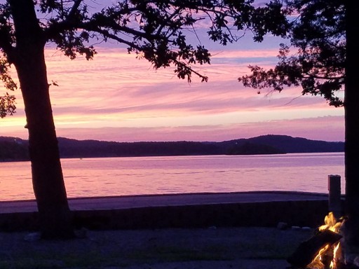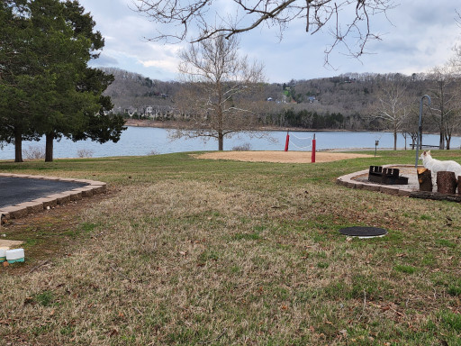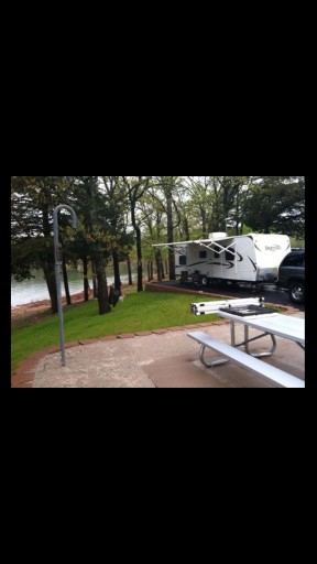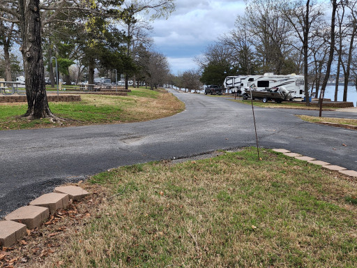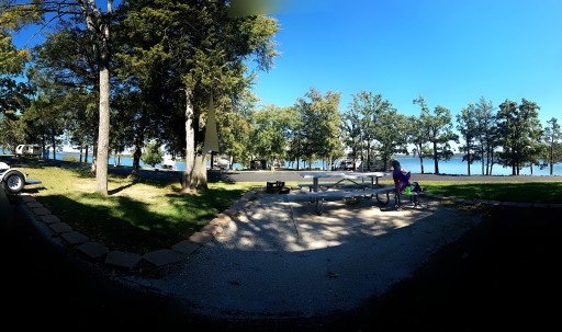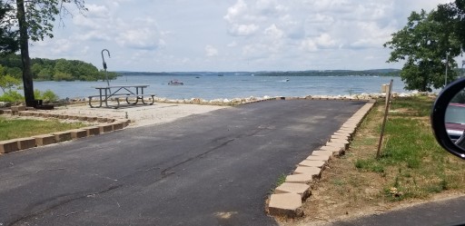 Fabulous level concrete pads with a great peninsula view! Easy walk over the bank to the water to fish or wade. Skinny dipping is forbidden!