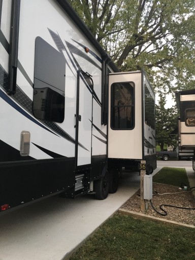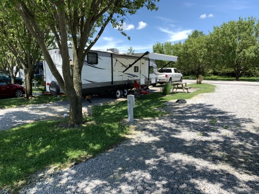 Site we got was almost level to start with. Paved roads, gravel sites. Drawback is that the sites are too close together! We had a mechanical problem with RV, but thankfully there was a Freightliner facility a few miles away on I70.
