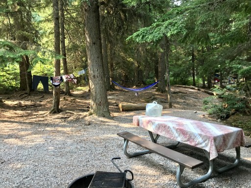 All sites are at least partially shaded and are roomy with options for tent placement. Each space has a small pull through parking area, most with trees to provide small privacy. We used a tent and had no problems but it looked difficult for those using camping trailers or RV's to fit around this relatively short and narrow area. Large stones separate the parking from the remainder of the site, so backing in isn't possible. Despite proximity to the main road way, it's pretty quiet. Shared bear proof food storage available. No reservations, but most mornings, several sites open up and if you get there early enough and ask people to make sure they are leaving that day, you can usually grab one. We showed up at 07:30 and were able to have our pick of several as people were getting ready to move on. Bathrooms were clean but dark, even midday. Short walk to picnic area at the creek and free in-park shuttle stop. A great base camp for exploring Glacier Park!