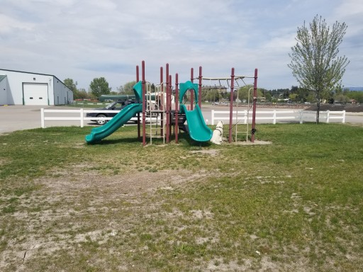 We parked near some trees in some lush green grass. The grounds are quiet and we are the only campers. The downtown is a mile away and a nice walk/bike ride through neighborhoods. There is a small playground and nice hot showers. The electric is just a standard plug-in, no 30/50 amp, but other than that, this is an awesome spot to stay in Kalispell!