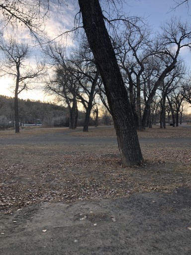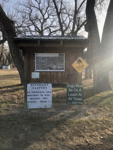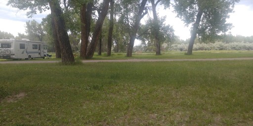 Camping provided by the County near the fairgrounds. Donations accepted. Well patrolled by the Sheriff's deputies. Huge cottonwood tress with some sites along the river. 1 3/4 miles of trails. Great boondocking with mule deer and pheasants in the alfalfa field. We were stopping for the night, but ended up staying three nights. Only two other campers, but the locals use it for a swimming hole.