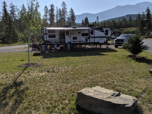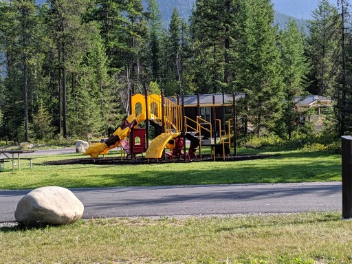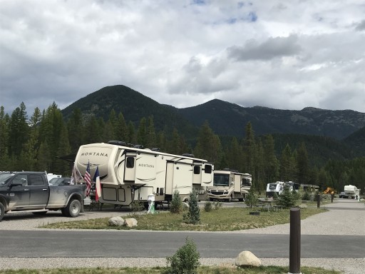 We stayed here for 5 nighs in our 40' fifth wheel. The park is new, only opened about a month ago. Very spacious, level, all pull-through spots. Paved streets, gravel lots, and grass lawn with picnic table and fire pit. There's a paved path to take a short walk right into the West Glacier Village. There is a playground for little ones and also plenty of room in the campground for kids to kick a ball around, and ride scooters and bikes. We enjoyed staying here while exploring Glacier National Park.