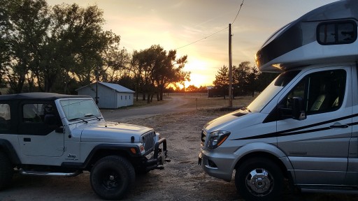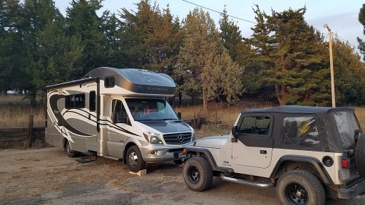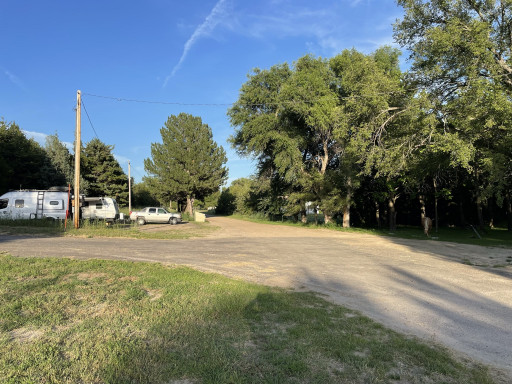 4 back in spots with 20/30 amp service from relatively new boxes. Water spigot available at west end of sites or across the road. Berm behind RV shields all but the most egregious jake brake from highway 2. Train Tracks run just south of park, but again, berm and trees block the worst of the noise