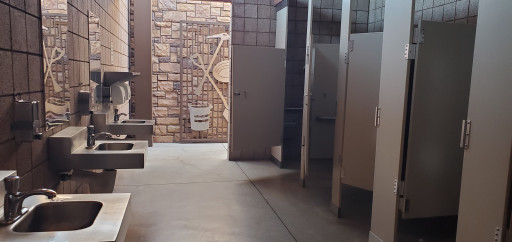 Large truck and RV area. Additional parking. Very clean rest rooms. Easy on and easy off.
