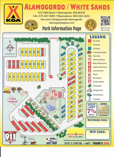 Having only stayed in Texas state parks, kids said "Awesome, best campsite we've ever been to, can we stay in another KOA?". They liked all the amenities like a grill, tetherball, horseshoes and pool (although it was too cold for Mom at 80 degrees and closes early when the sun goes down). Friendly staff. They let us check out sleds for White Sands (free). Easy drive to White Sands to play. Dog park ok but dog definitely preferred it over the gravel that is typical for the area landscape.