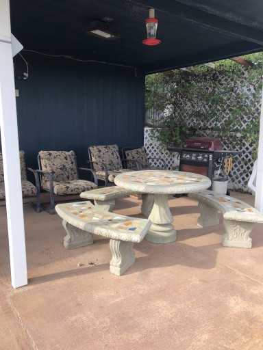 Owned by Marvin and Anita Farley. $35 for 2 adults/night. $3 extra people. Back in Full hookup. Small fenced in gravel establishment but clean and very well-maintained. WiFi Laundry and Showers. Seems like one permanent resident (besides the owners who own the house attached to the office on property). On main road but surprisingly quiet. Beautiful garden and patio