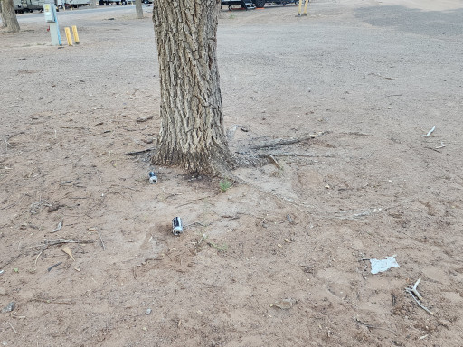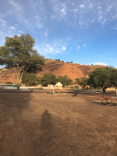 Many sites are on packed dirt/gravel. For desert area many have small trees to offer some shade. Hiking trails typical of the desert. Very windy so we canceled our barb-q plans. No wood available. Some campers appear to be living there, some highway noise but it is in the distance. Ask for key to restrooms when checking in. Sites have electric and water that all appear to be working. 2 dump stations, water at waste station located as you exit valve is broken so forget rinsing anything. Sewer cover at same dump area lid removed with large enough opening that a small child or animal could fall in, I replaced it the best