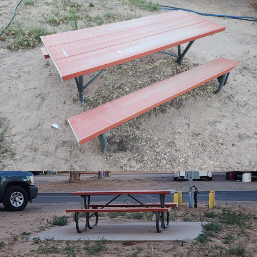 Picnic tables are on back side of camper. Reserved a site months in advance and needed pull through to handle towed vehicle. Received online message that day for check-in that included my site number. Somebody else was in it. Just missed office closing but a worker was around I talked to. Said take another site, double bookings happen all the time. Was lucky to find a site. It's a no for me!