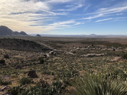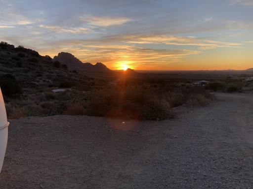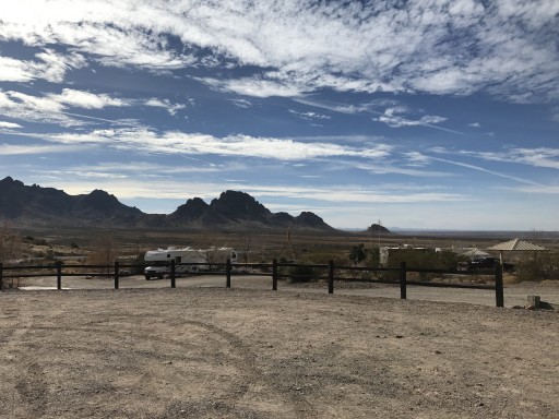 In space 17 in a 38' DP. Big lot. Excellent views into Deming and the Florida mountains. The drive in on 143/Stirrup road sucks. Bone jarring rough. We'll check out 141 to see if it's smoother.