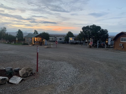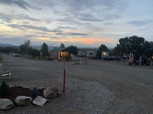 The RV park is located right off of I-40, easy access. Dirt, but solid, decent site size. Managers are very helpful & accomadating. Rate is fair for service & area. Called ahead & glad we did. They have quite a bit of sites filled. We arrived in our 34' 5th Whl. Water taste bad there, so bring bottled, but otherwise this is a great place for an overnight stay, and is conviently located by hwy, but not too close for noise to bother you. My husband and I enjoyed our stay. A beautiful scene of the mountains.