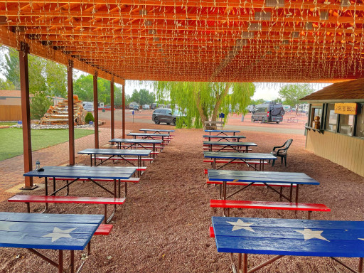 Well kept campground on Rt 66 with nearby actice RR tracks. We kept our RV AC fan running at night and slept like babies. They offer delicious smoked ribs, pulled pork, and chicken dinners at a great price. We got 2 pulled pork sandwiches with 2 sides each and drinks, an extra large scoop of ice cream, all for just under $24. Sites are close, but that doesn't bother us.