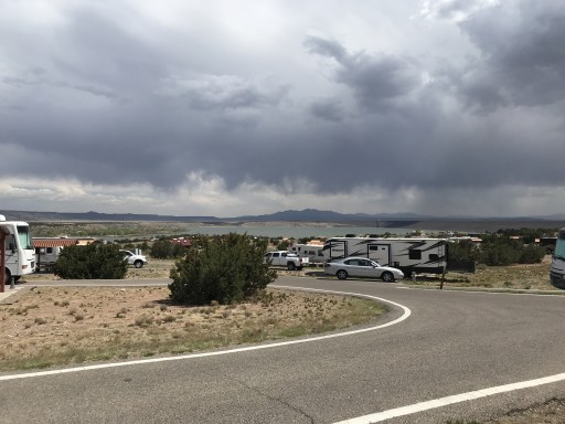 Site in the Buffalo loop with elec & water. Cement spurs (very level), table, and shelter. $10 with the senior pass. Visitor Center has some great displays, trail maps and information. Showers were push button but nice and warm. Good view of lake and very relaxing.We traveled from here to Bandalier NP and Santa Fe is 30 minutes.