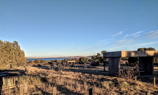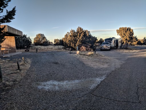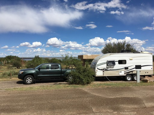 We were traveling west on I 40. Great first stop in NM. We were in 23 foot trailer. Loop A Of Campground has water/ 50 amp. Cement shelter and picnic table. Bathroom was clean and shower was hot. Facilities are pretty warn, area was so dry, no fires allowed. Easy hike down to lake.