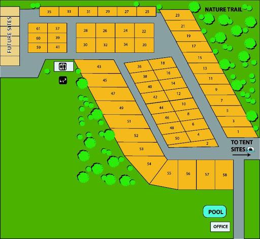 This is a wonderful small place but the sites are very small and very tight and a dirt road to get to it with about a 9 degree incline that was partially washed out when we went, fist site they took us too couldn’t support our weight and we had to be moved, jacks pushed into the gravel about 10” again very nice people but this location is not set up for bigger heavier rigs
