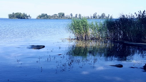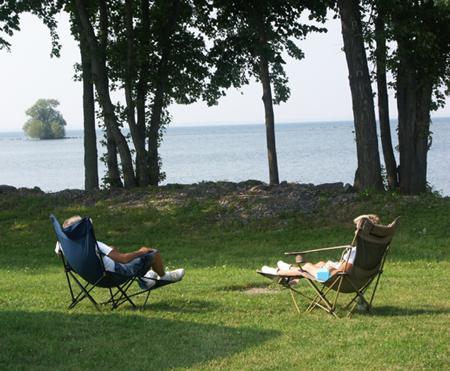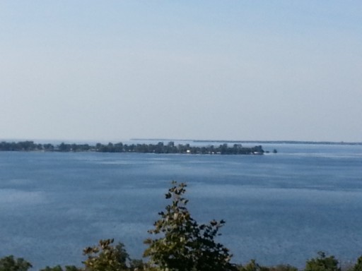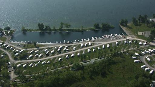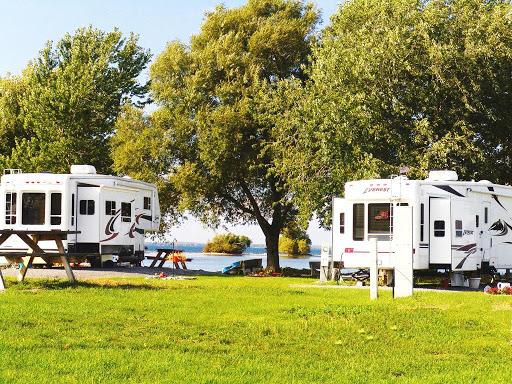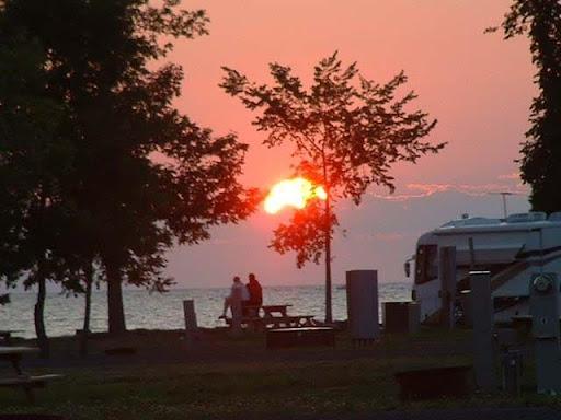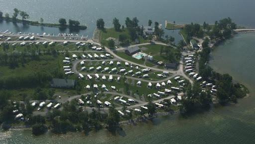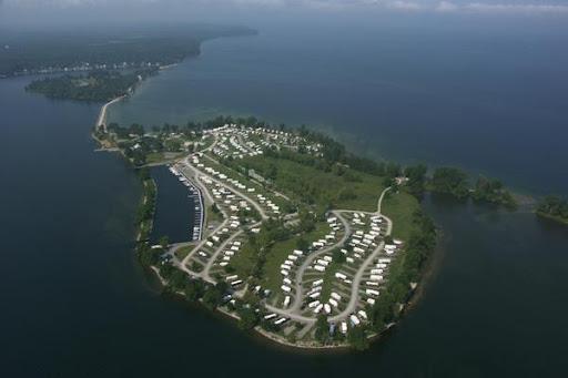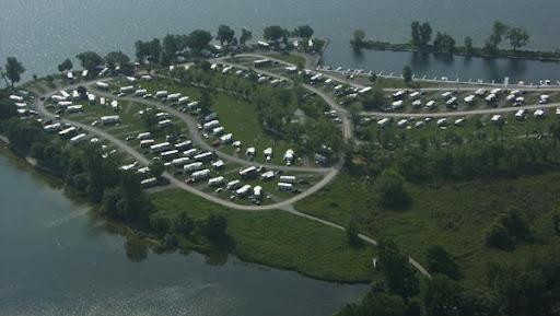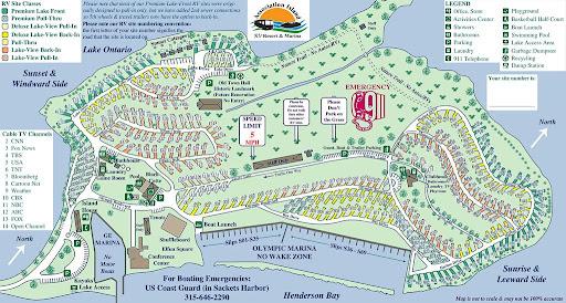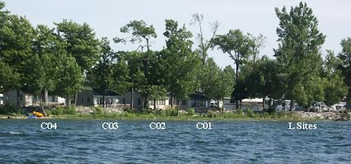 This park is unique. The KOA park occupies an entire small island in Lake Ontario, accessible by a causeway. Water views at most sites. The park is very well maintained and the staff is friendly and helpful. We were at site E03 on the sunset side of the island. Our site was large and grassy, two rows back from the water but elevated so we had a water view. No problems navitaging this park with our 40 foot motor home. This is our second visit, and we'll be back. Love this park.