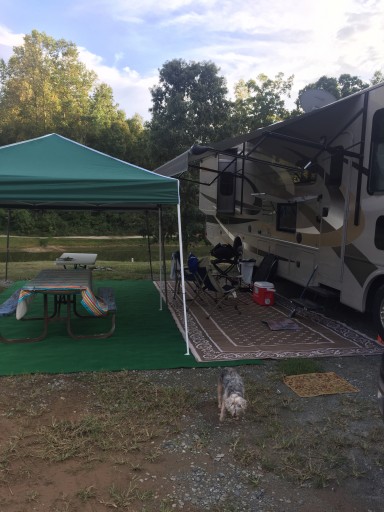 Our designated site ended up being a little too tricky to back into so we were allowed to park in another site typically reserved for long-term rentals. We've had our fair share of tricky sites being full-timers and over 100 campgrounds in the past year, but this was one of the toughest because of the sloped roads, hills, trees, tree stumps, and the large ditches on both sides of the road.