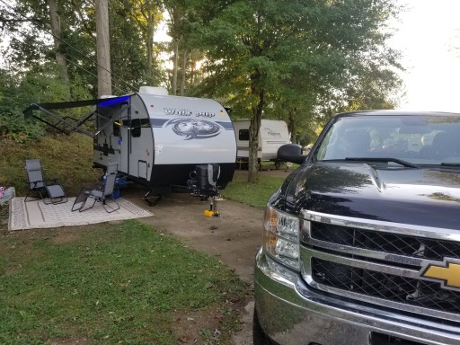 We spent two nights here at the end of a three week vacation. We arrived after the office closed and easily found the self checkin box. We stayed in one of the upper sites. Our 30' trailer took up the majority of the pad. The pad was sloped quite a bit and we maxed out our Anderson blocks getting it leveled. Most pads looked as though they had been patched and rebuilt over the years. Space was tight and we had to park sideways in front of our rig. The faucet connection was almost touching the ground and set in a muddy hole.