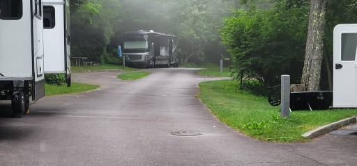 Flush toilets and running water sinks. Supposedly they have showers, someplace, but we never found them...didn't look too hard, either, though. Mostly back ins, but a few pull throughs. Some "pull through sites" are just wider areas of the road. Be aware when booking, the length they give for those sites are from where the road just STARTS to widen. It may say the site is 40' long, but if you use the full 40' your corners will be sticking into the road on both ends. Only about 20" is usesble. Ask me how I know. Most sites are shady, but a few are ok for solar if you use that. Close to hiking, overlooks, and Mt Pisgah Inn with a pretty good restaurant. There is a dump station that may be sporty for larger rigs to get into (which we are). Did not use.