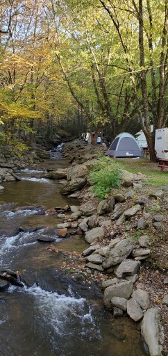 E/W waterfront sites on the stream running through the park as well as cabins in one area. The RV area is on the other side of the office. Fire rings and picnic table each site, clean bathhouse convenient to sites. Firewood and ice for sale at the office.
