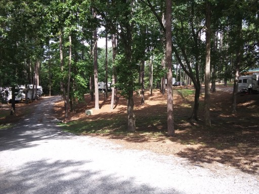 There are lots of trees to provide shade. Very few of the sites have view of the lake; these are at the top of the hill. The ones that do look like they may have a little easier time of leveling their rv. We were in site 21.