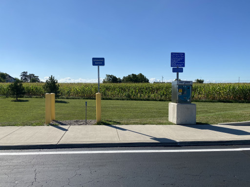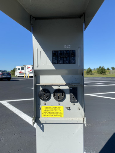 We travel full-time for work and we love it when we come into Ohio with these amenities for RVs. Drinking water and dump station on the exit side of the RV section. 30/50amp plug at site. $20 a night. Very clean and well kept. Excellent lighting. Also the plaza has restaurants, bathrooms, gift shop and dining area. We cook at “home”, but nice area to walk around in. We love these as when we are traveling you pull off, hook up, sleep, unhook and back on the road. Absolutely love it!