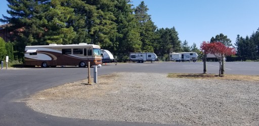 Steep hill to entrance. Big paved lot behind lodge building. Sites are gravel back ins with vegetation. 30 amp and water for $20/nite. Laundry room. Good energy.