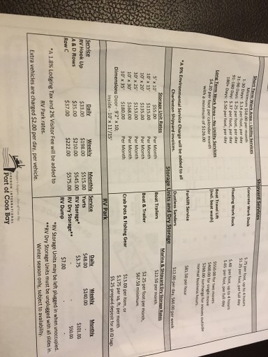 A parking lot with picnic tables. Walking distance to docks, crabbing and restaurants. Very clean. Operated by Port of Coos Bay.