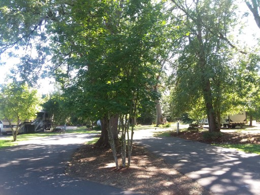 Be aware - the entrance road from the highway is easy to miss. However, once inside, we dropped into a well-designed glade/park which is easily navigable with generously paved lanes to level spaces. Lots of shade trees and grassy lawns abound. Although our space was physically close to the highway, the trees and foliage were dense and thick enough to visually isolate us from the road and we didn’t really notice any significant highway noises. Although this was far and away the priciest park of our journey, it was also so nice and comfortable that we decided to stay here again on our return trip as well.