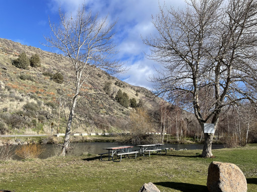 they kicked out homeless. cleaned it all up. but now no camping.....nice place to stop for a break and let the dogs out. vault toilets were nice and clean. right off 97. nice little water streams with clean water. a little walking bridge. plenty of green grass & shade trees. small boat launch. i think access to the lake. would have been a nice convenient place to spend the night while traveling if the homeless wouldnt have ruined it...... now just a nice park to take a break!