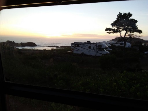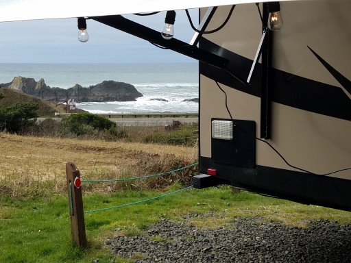 We spent 7 nights in spot 40 at Seal Rocks RV Cove. This is one of the full hook up sites with 50 amps and it is a large spot with a front row view of the ocean. It was plenty roomy for a 35 foot fifth wheel and our truck. One is not crowded in by others. It is directly next to the path that leads to highway 101 where you can - at your risk- cross the busy road to access the beach.