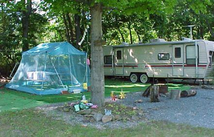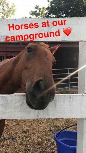 This is a BIG campground...with nice amenities for all types of campers & motorhomes. We chose a pull thru site in the back of the park. Most sites will require blocks to level because it's a hilly campground. The staff is friendly. They had scheduled activities while we were there {food trucks, band, crafts & games}. Definitely a family friendly atmosphere. Beautiful stables with rescued horses in the pasture, as well as stalls available for those who bring their own horses {trails begin at the campground}.