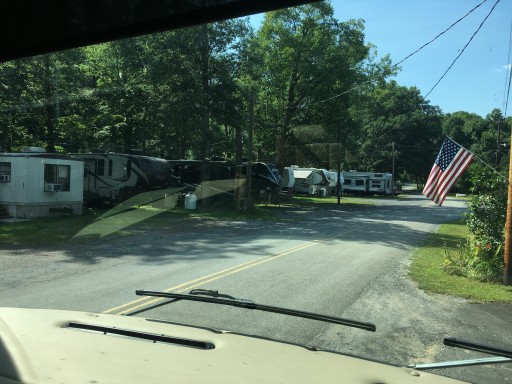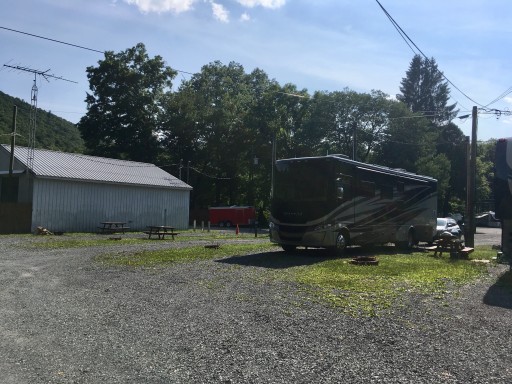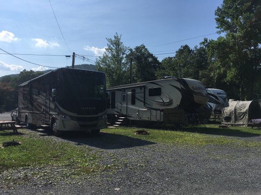 The campsites are very tight! We have a 35' Class A and we were able to pull though with no issue. The site was level and the full hook up was sufficient. We could not roll out our awning until the rig next to us left, the sites were that tight. Having a creek run through the campground was nice however many fill-timers have domesticated access. If we return to this area, we would research other campgrounds. The staff made efforts to make us feel welcome. If you are looking for a reasonably priced, overnight stay area, this campground is not a bad "one nighter". This would not be my choice for a destination visit.