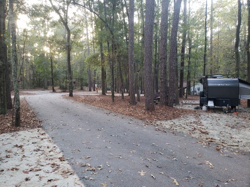 Nice small park and campground very close to I-95. A bit of road noise from adjacent US-15. Tall trees scattered about with very few smaller trees and no shrubbery between sites. The mostly small E/W/S sites are sand or stone, oriented to provide some privacy, and kept clean by the host. Another reviewer mentioned that site 15 is level, but we’re in that site and it isn’t. After a quick walk, looks like about half the sites are level. Sites are quite different - some wide and short, others very narrow, a couple long enough for a moderately sized rig, some pull throughs. Bathhouse is well cared for and very clean. Nothing much to do in the area except paddle on the river or head to Charleston (hour drive). The office was closed when we arrived, but the host was present to hand us our tag. Mid-March; trees have already leafed out and Azaleas are in full bloom.