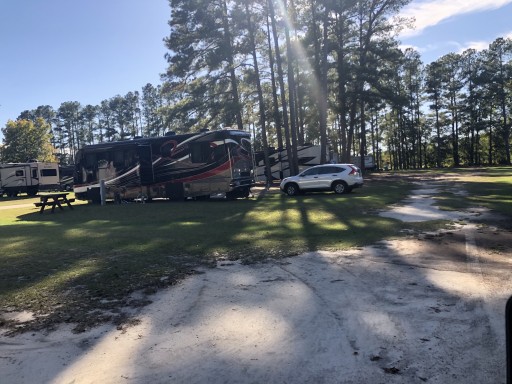Stopped off here for 2 nights on our way to Florida. Called 2 days before for reservation. Lady on phone was very nice. Gentleman in office when we arrived was also very nice. We were in A10 and it was very level. Decided not to unhook from truck and didn't even put down any jacks. It is all grass and white sand and they keep it very clean. Shower house was very clean and nice. My only complaint would be that they only have 2 washers and driers and they were quite busy all day Sunday. We travel full time so need to do laundry on the road. Only had one load that needed washed but it took almost 4 hours before there was an open washer.